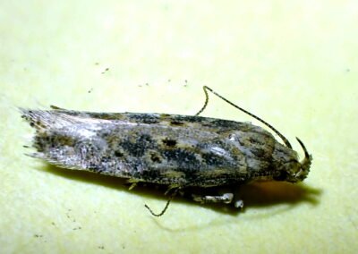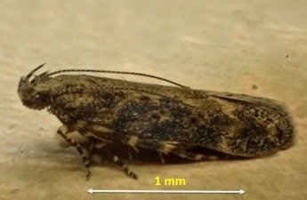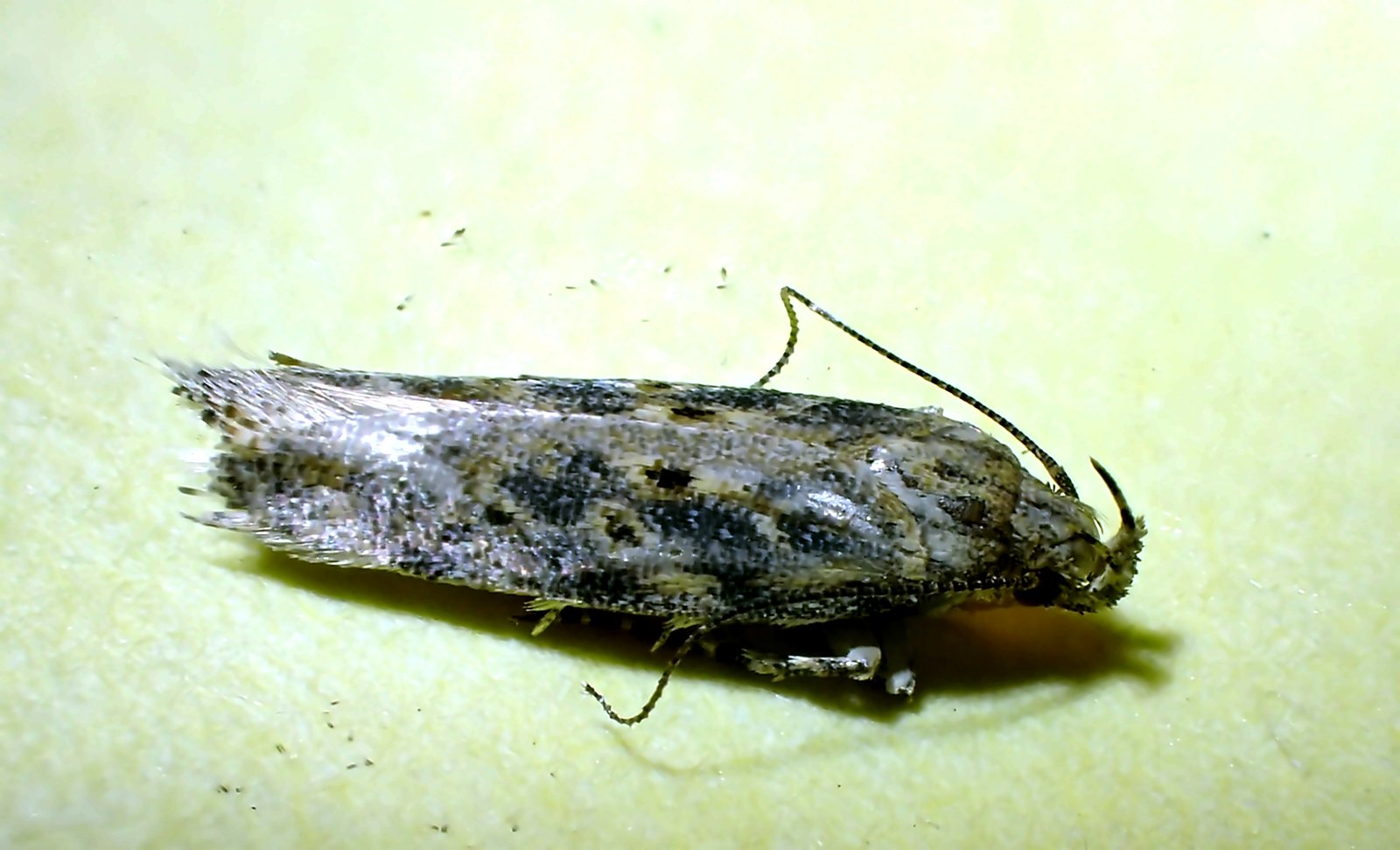 Motyl ma rozpiętość skrzydeł wynoszącą 12 – 14mm. Skrzydła szaro-brązowe usiane drobnymi ciemnymi plamami z jaśniejszą otoczką z udziałem łusek rudo-pomarańczowych. Tylna para skrzydeł jest jasnoszara. Jaja lekko eliptyczne o długości ok. 0,5 mm, białawe o perłowo-żółtawym połysku, ciemniejące w późniejszym czasie. Gąsienice zmieniają barwę ciała wraz ze wzrostem. Młodsze gąsienice początkowo są zielonkawe lub oliwkowo- zielonkawe. Ale już najstarsze stadia larwalne wyhodowane w laboratorium były barwy od oliwkowej do malinowo-brązowej z 2–3 podłużnymi paskami w kolorze blado-różowym na części grzbietowej, o długości 10 do 12 mm. Poczwarka typowa dla motyli barwy brązowej.